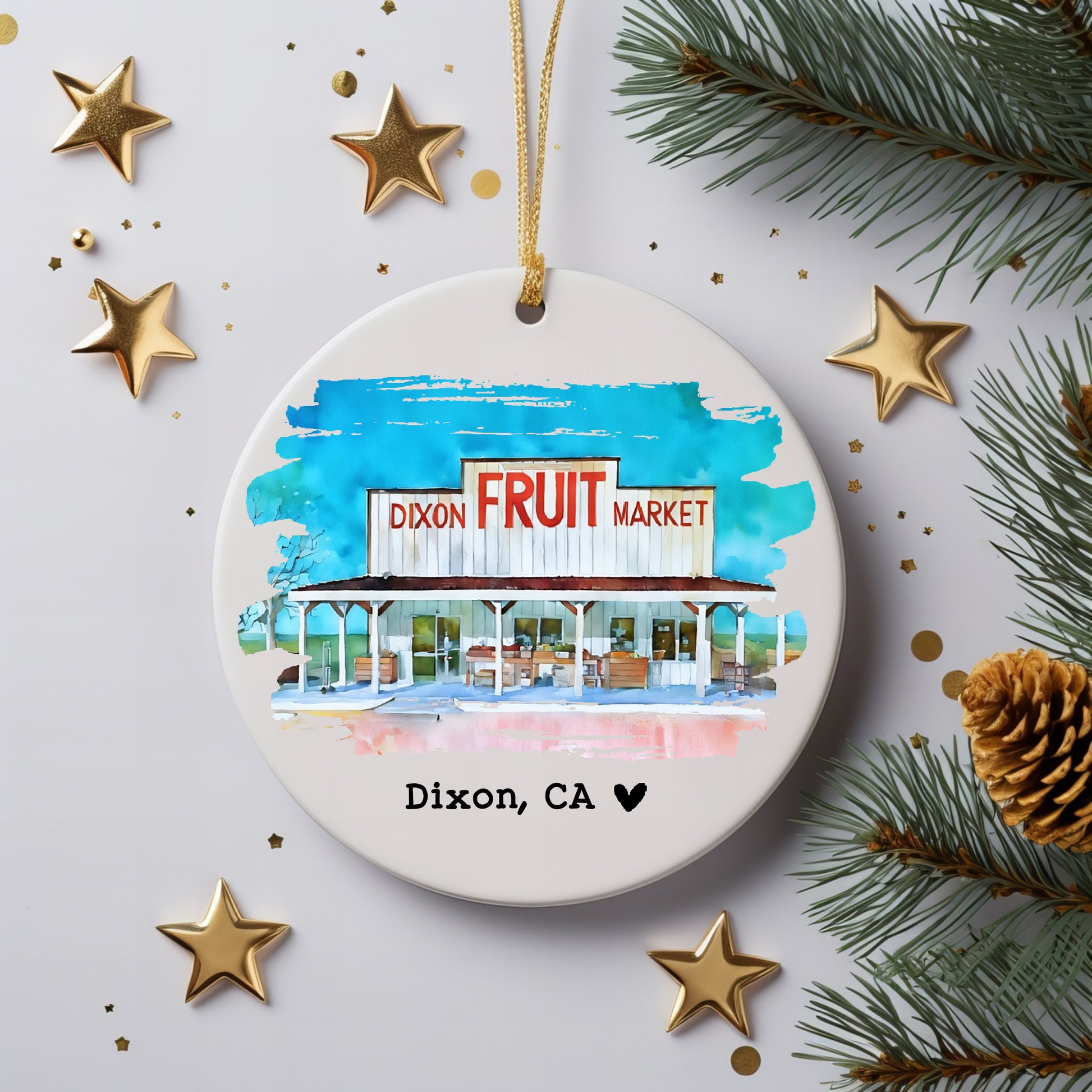 Honor the charm of Dixon, California with this lovely 3" ceramic ornament displaying a watercolor rendering of this special place. Ideal for personal enjoyment or as a meaningful gift, it arrives adorned with a rustic frayed ribbon in naturally shifting colors. Craving something custom? Reach out to us and we'll design a one-of-a-kind ornament tailored to your preferences.